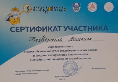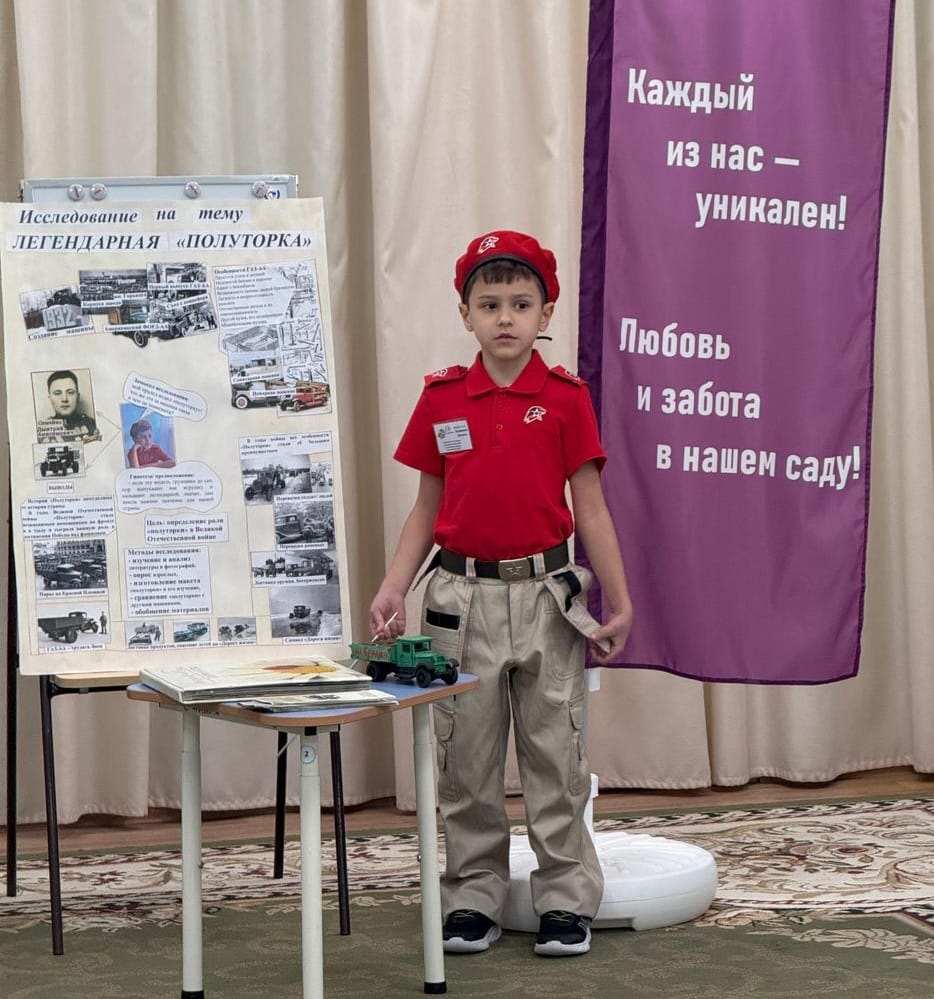 19 марта 2025 года состоялся этап городского тура Всероссийского конкурса «Я — исследователь». Событие состоялось на базе МБДОУ№ 42 города Ростова-на-Дону. В секции «Техника и физика» он представил на суд жюри исследование «Легендарная «полуторка» (наставник — Фоменко Е.В.). О машине — герое и бойце, символе «Дороги жизни» — грузовике ГАЗ-АА.